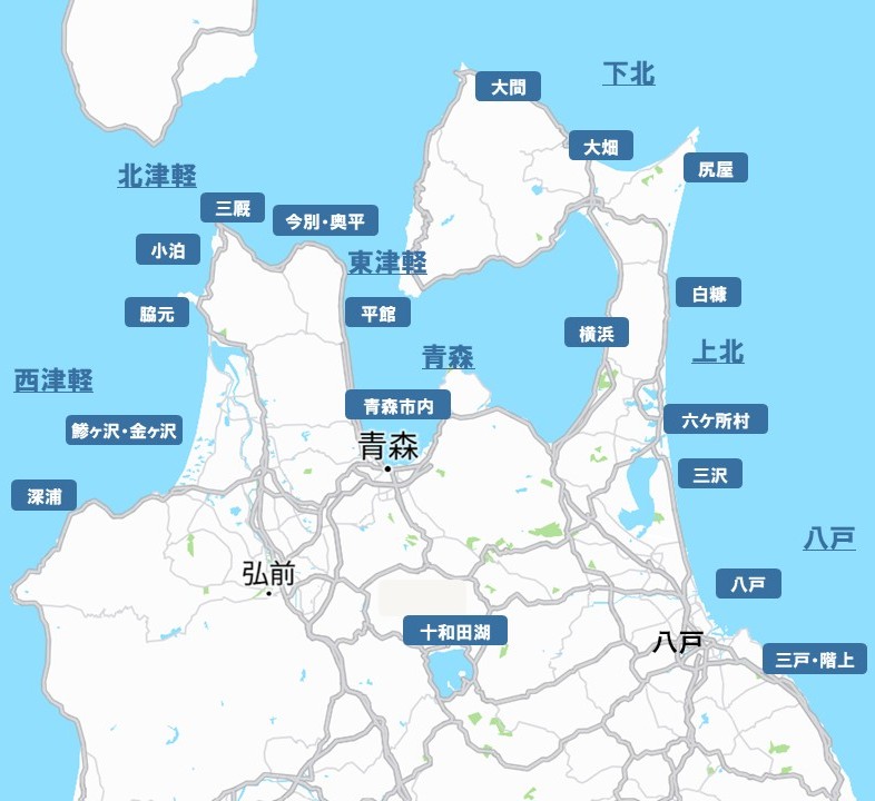 北津軽 ➤三厩 小泊 脇元 今別/奥平 東津軽 ➤平館 西津軽 ➤鯵ヶ沢/金ヶ沢 深浦 青 森 ➤青森市内 下 北 ➤大間 大畑 尻屋 上 北 ➤横浜 白糠 六ケ所村 三沢 十和田(釣り場) 八 戸 ➤八戸 三戸/階上