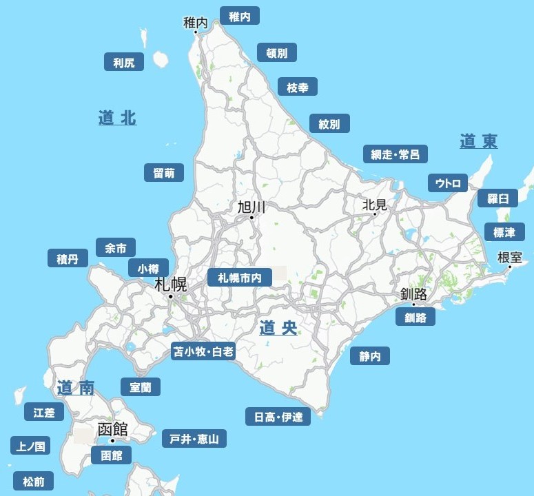 道 北 ➤稚内 留萌 利尻 頓別 枝幸 道 東 ➤紋別 網走/常呂 ウトロ 羅臼 標津 釧路 道 央 ➤小樽 余市 積丹 日高/伊達 苫小牧/白老 室蘭 札幌市内(釣り場) 道 北 ➤江差 上ノ国 松前 函館 戸井/恵山